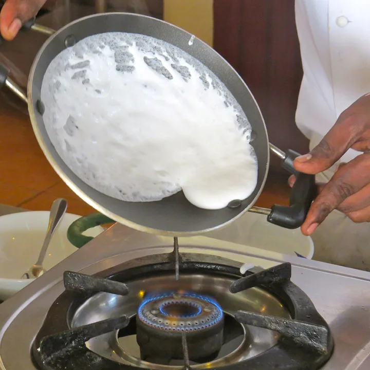 Varm en buet non-stick-panne og tilsett litt kokosolje. Ha i litt røre og virvle pannen rundt med et tynt lag med røre som når du lager tynne pannekaker. Sett på lokk. Appamen er ferdig når røren er stivnet og den ser ut som en buet blondeserviett.