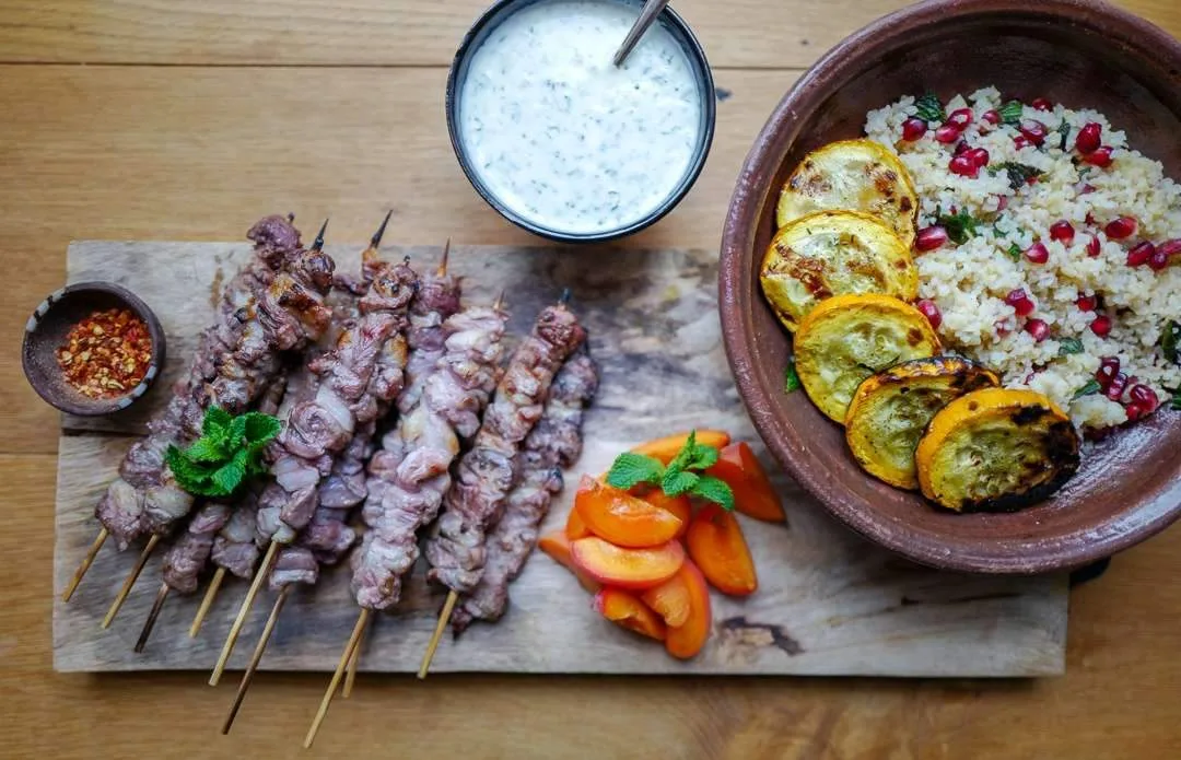 Til retten serverte jeg en bulgursalat med grillede skiver gul squash, granateplekjerner og mynteblader. Litt god olivenolje over til slutt.