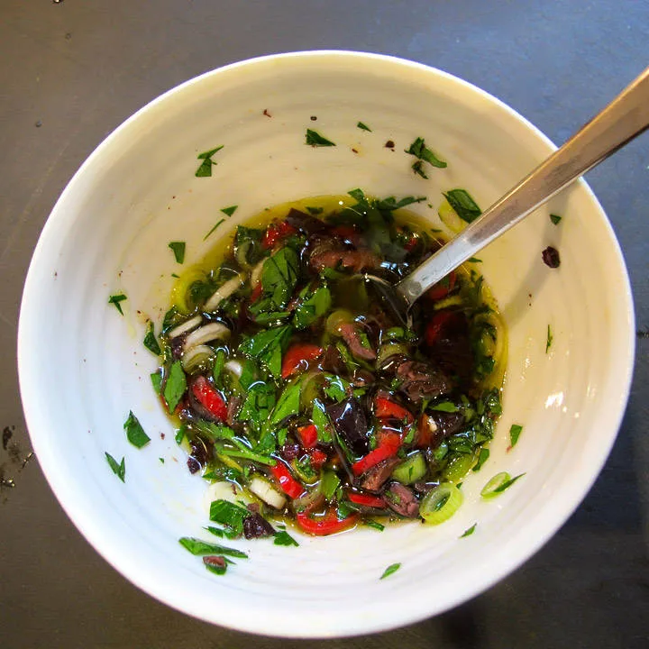 Bland dette i en bolle og tilsett en klype flaksalt, saft fra 1/2 sitron og 6-7 ss god olivenolje. la stå på benken i 1 time for at alle smakene skal blande seg.