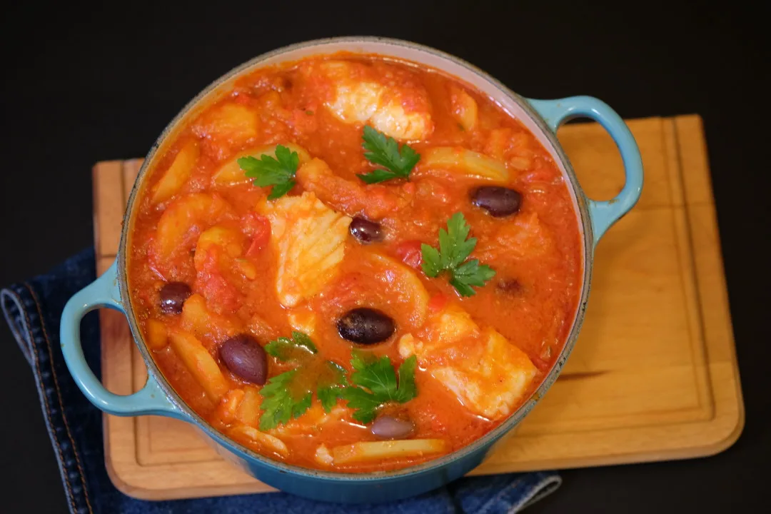 • Tilsett oliven og fiskestykker. Fisken legges på toppen av gryten og lokket legges på. La fisken trekke i sausen i 10 minutter. Nå kan du servere bacalao til hele gjengen.