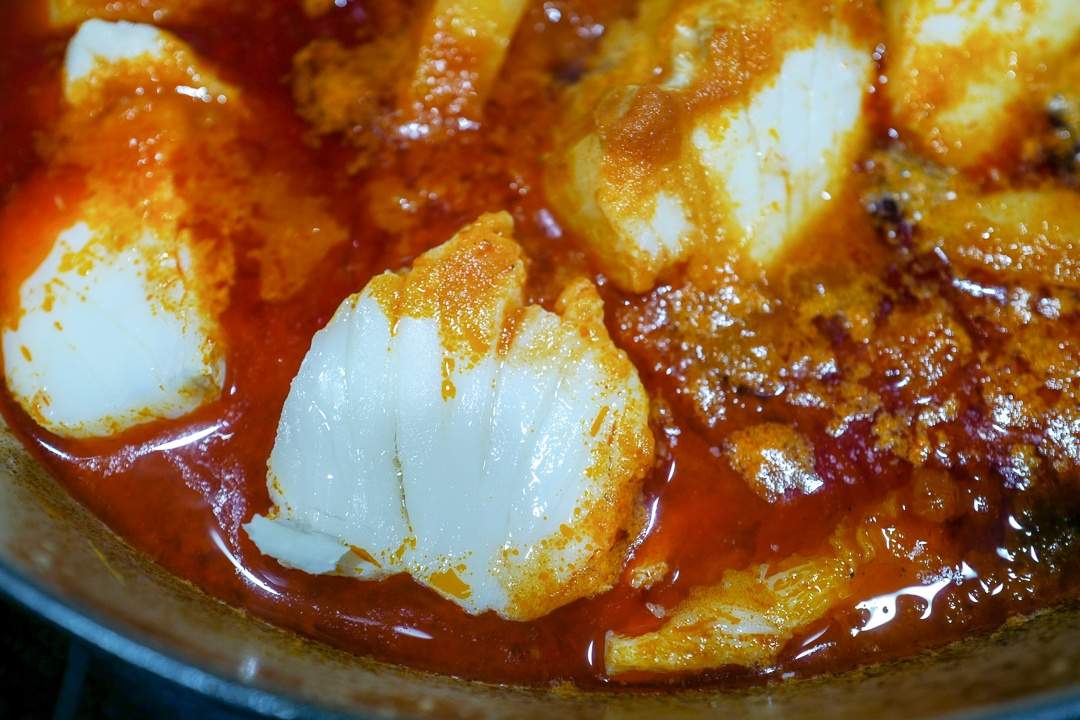 Hva gjør den så spesiell? Jo, sausen står å putrer i ca fire-fem timer, Helt til oljen skiller seg ut og legger seg på toppen som et deilig lokk. Min bacalao er proppfull av smak. Jeg bruker masse paprika og jeg bruker også chorizo. Jepp, det høres sikkert rart ut, men chorizo og torsk er bestevenner.