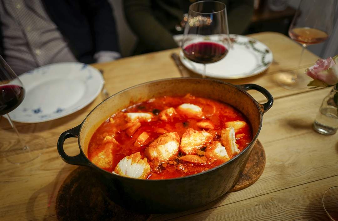 Surr løk og chorizo i litt olivenolje til løken er myk. Tilsett portvin/rødvin. Rør og tilsett hvitløk, parikapulver, paprika og tomatterninger. La dette surre noen minutter før du tilsetter passata. Fyll opp den tomme flasken med vann og tilsett dette også. Kok opp. Senk temperaturen til medium og legg på lokk. La dette stå å putre i et par timer. Tilsett litt salt og pepper og oliven. Hell resten av olivenoljen i retten og sett på lokket igjen. La stå noen timer på lav temperatur. Kok potetskiver i lettsaltet vann. Legg dem i gryten med sausen og vend forsiktig. Legg fiskestykkene på toppen og sett på lokket. Når fisken er kokt kan du servere retten. Jeg gikk på Vinmonopolet for å få hjelp med vinvalget. Jeg fikk anbefalt å drikke en portugisisk rødvin til, og sånn ble det. Niepoort Fabelaktig Douro 2018 er rimelig og et perfekt valg til min bacalao. Portugisisk vin til portugisisk mat. Ganske logisk, det.Bacalao på min måte