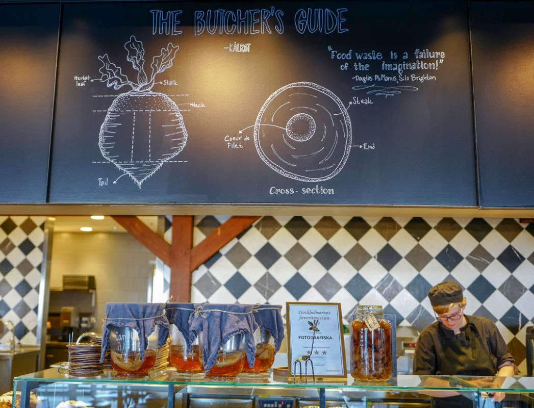 Bærekraft er noe som er gjennomgående, fra bygningen, innredningen og maten de serverer. For å unngå unødvendig transport har de valgt bærekraftige materialer som finnes i Sverige, og de kjøper bare inn europeiske viner fra et nøye utvalg fra små vingårder. Vi sorterer sitt avfall og matavfall blir til biogass.