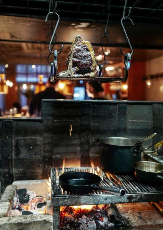 Alt tilberedes over ild i restauranten. De bruker bjørketre, ingen strøm eller gass – kun røyk, ild, aske og varme.