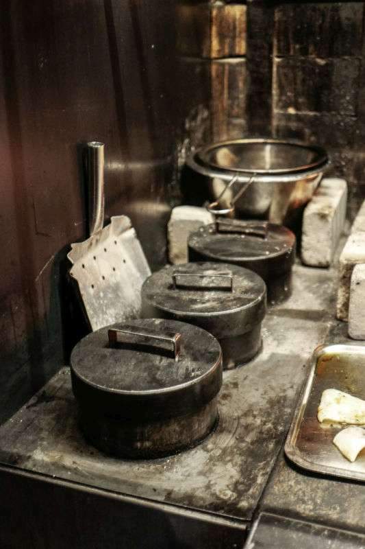 Vi får også en omvisning i kjøkkenet der vi ser hvordan det å tilberede mat over åpen ild fungerer. Her er det stabler av bjørkeved, urter og kvister for å gi røyk og smak til ingrediensene. Vi ser grillrister og gammeldagse kokeplater. Det er steike så varmt bak på dette kjøkkenet og jeg trygt forestille meg at man må passe på væskeinntaket når man jobber under slike ekstreme forhold.