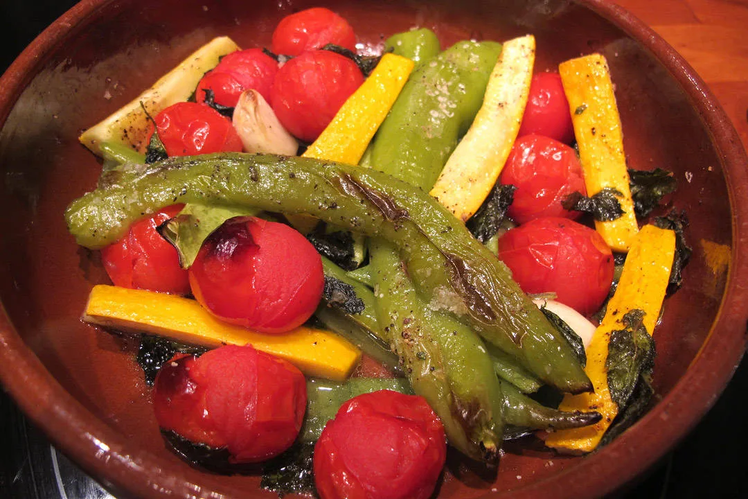 Det er tid for grilling og man må variere tilbehøret fra tid til annen. Mitt tilbehørstips i dag er en deilig ovnsbakt salat bestående av gul squash, cherrytomater, hvitløk, bredbønner (aspargesbønner kan brukes), grønne avlange paprika (de vanlige kan brukes), frisk mynte, olivenolje,salt og pepper.