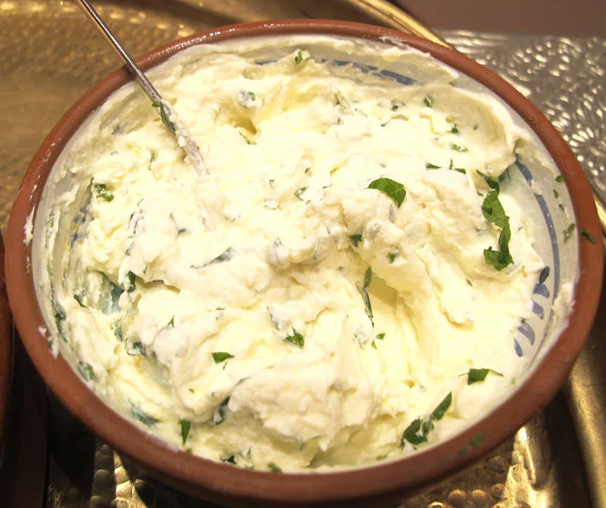 Bland sammen marscarponekremen. Den lager du av et beger mascarpone, finhakket mynte, finrevet sitronskall av 1/2 sitron, en spiseskje melis og et par spiseskjeer sitronsaft.