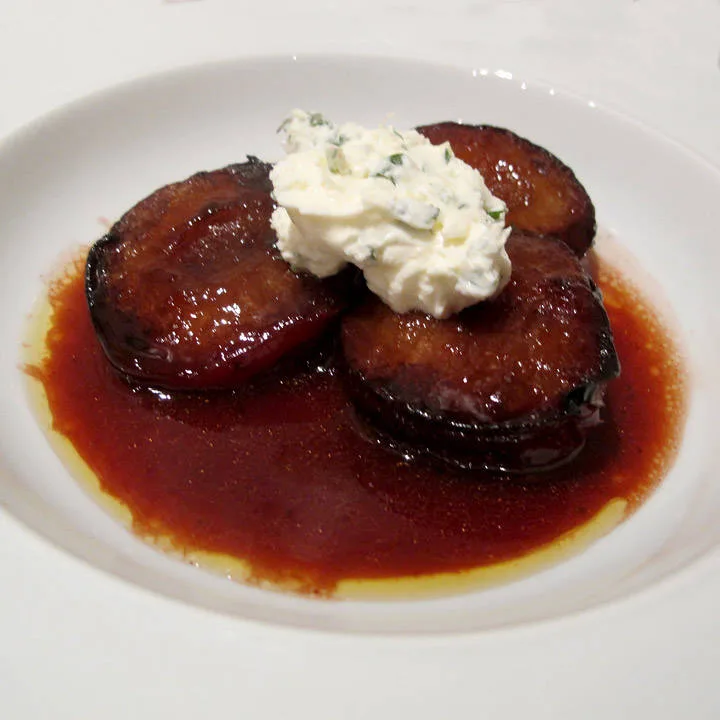 Varm en panne og smelt 5 ss brunsukker. Tilsett 2 ss smør. Hell over et shotglass med cognac, rom eller calvados. Tilsett en liten kanelstang og et par stjerneanis. Legg plommene med snittflaten ned i pannen. La dem ligge der i 5 minutter.