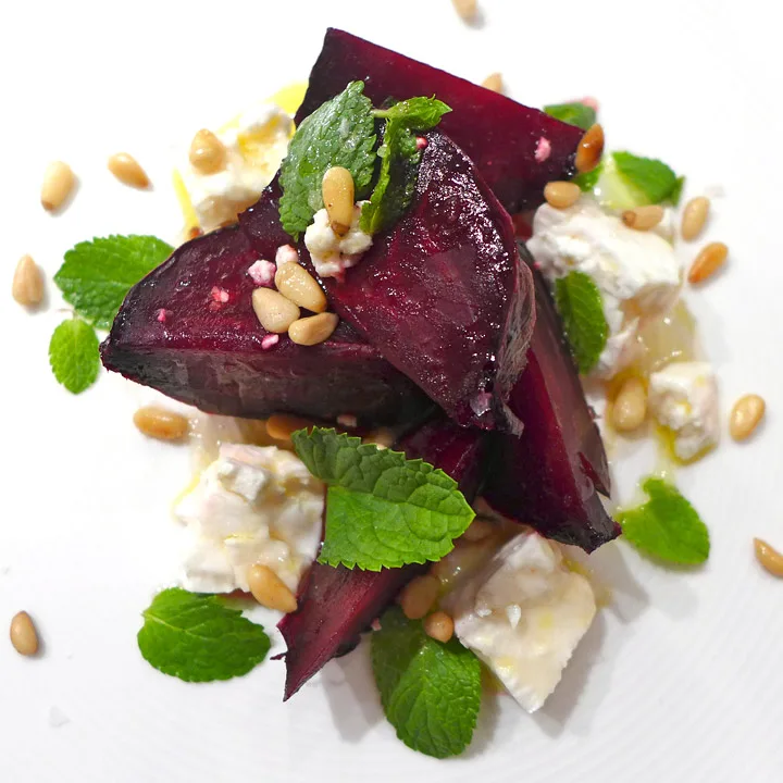 Legg rødbetene på et fat. Smuldre store biter fetaost over, hell over bittelitt flytende honning (akasiehonning er bra), masse god olivenolje og ristede pinjekjerner (rist i en varm panne til de får farge).Ha masse deilige mynteblader over retten. Til slutt drysser du litt godt flaksalt og litt pepper over.