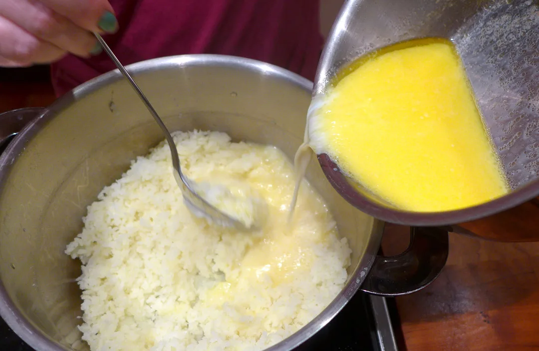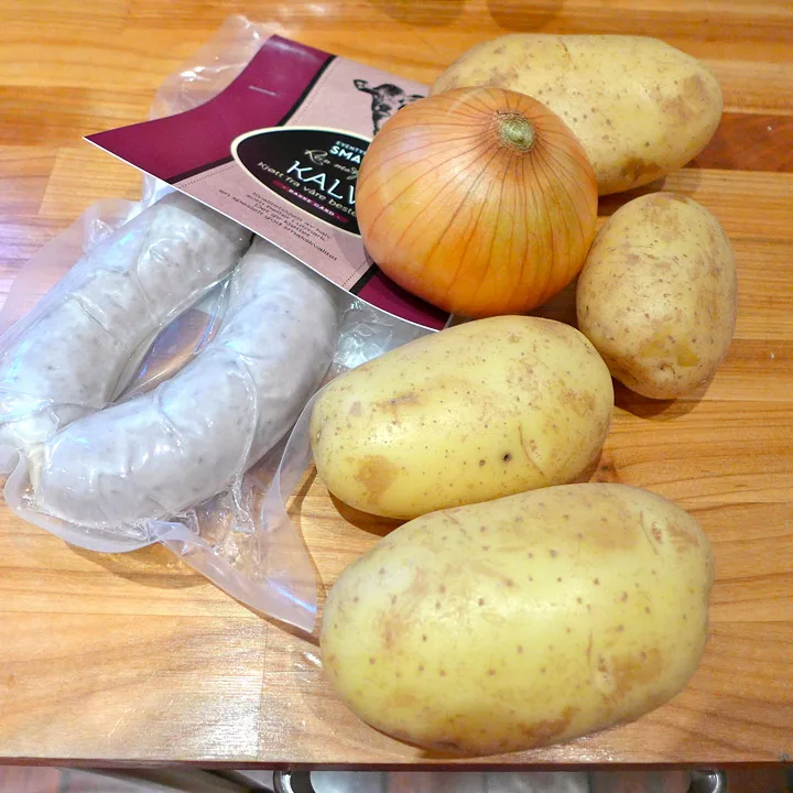 Pølsene: Disse steker du hele på medium varme til de er ferdige. La de hvile litt før du skjærer dem skrått over. Potetene: Skrell poteter og skjær dem i store biter. Kok dem til de er møre. Hell av vannet og mos dem med rotfruktpresse eller moseværktøy. Smelt 50 g smør og hell 1 dl melk i gryten i det varme smøret sammen litt revet muskatt og salt. Bland dette i potetmassen og rør godt.