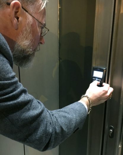 På forhånd har Erik og jeg betalt inn et depositum på 200 euro. I retur har vi fått en ID og en kode. Dette skal brukes for å låse oss inn i restauranten. For denne restauranten, som sikter mot høyeste utmerkelse i Michelinguiden har ingen fancy inngangsparti. Bygget likner en offentlig bygning eller et kontorbygg. En kodeboks utenfor døren er alt det er foruten en meget diskret logo høyt oppe på veggen. Du skal vite at det er en restaurant her, for å si det sånn.