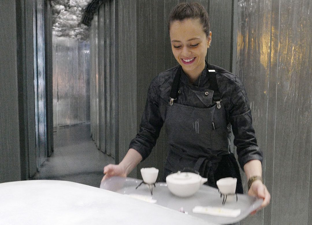 Vi står ved et lite bord og får servert en fruktte med en middelhavsblomst i som skal forberede magen på de over 40 rettene som kommer. Når jeg sier retter er det heller munnfuller som serveres eler retter som skal spises i to-tre biter. Teen serveres i den flotteste spesieallagde matte porselen i en slags kremmerhusform. Koppene støttes av en wireaktig kreasjon. Hele seansen er inspirert av en japansk teseremoni.