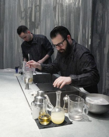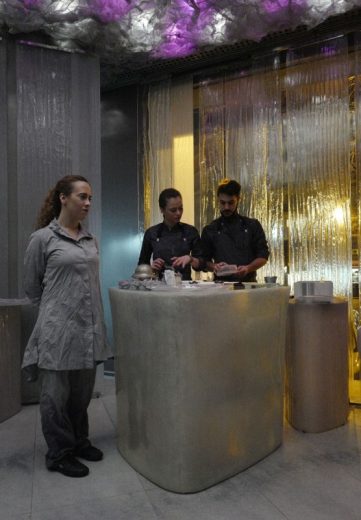 Så blir vi ført til neste rom som er en cocktailbar, La Barra. Her skal stemningen opp før selve måltidet serveres. Vi får fantastiske cocktails, som for eksempel en kube som du legger på tungen og ut renner den deiligste Mai Tai laget på mango og rom når skallet på kuben smelter. Små snacks serveres til alle cocktailene vi får servert. En som definitivt må nevnes er en florlett kule laget av ost med strimler av marrokanske syltede sitroner på toppen. Hver snack forandrer smaken på cocktailen. Cocktails nummer to serveres i et martinglass og har flytende elementer på toppen. Det ser ut som den vakreste kirsebærblomstringen langs en av elvene i Japan der sesamfrøene og de frysetørkede fruktelementene danser på toppen av væsken.
