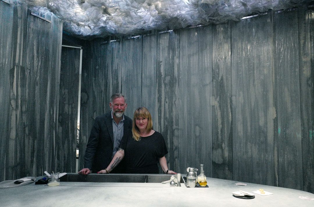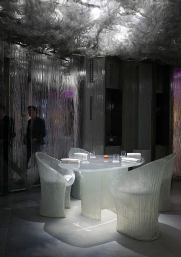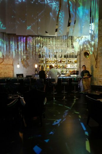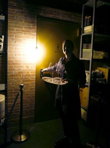 Til teen får vi servert noen små munnfuller med syltede kirsebær og noen syltynne krystalflak med yuzu og wasabi før vi blir ført inn i neste Enigma: La cava (vinkjelleren). Musikken her inne er en kombinasjon av bølger og ufo-lyder (hvis det sier noe som helst) Det er her vi skal bestemme drikke til maten, samt får et par cocktails til enda flere munnfuller. Vi får et glass regnvann fra Patagonia. Ja, regnvann… Det smaker vann, selv om Erik prøver å påstå at det smaker bløtt og helt annerledes enn springvannet vårt på Frogner. Jeg vet ikke, jeg.