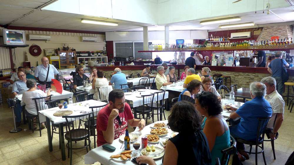 Vi følger etter to spanjoler i 60-årene som ser ut til å være litt mer kjent med stedet enn hva vi er. Vi kommer først inn i et skur med utebord og en stor vifte. Det er 35 grader i Barcelona denne dagen, så bord innendørs vil være å foretrekke. Vi går inn i selve restauranten, et slitent lokale som ikke er fornyet siden midten av 50-tallet om ikke lenger siden. Det henger en defekt messingvifte i bare ledingen ned fra taket. Det er tydelige flerrer i taket. Det er halvfullt, men på alle bordene står det «reservado». De to herrene foran oss går frem til en superstressa servitør og snakker med ham. Han rister på hodet og sier at her må man ringe i forveien og bestille. De to karene vender seg om og rister på hodet til oss mens de slukøret går ut av restauranten. Så er det vår tur. «Har dere bestilt?» «Klart vi har bestilt! Navnet er Valebrokk». Servitøren lyser opp og fører oss til bordet vårt der det står «Valen Brok». Vi kan slappe av og sette oss mens vi ser på alle de stakkars sjeler som blir avvist i døra.