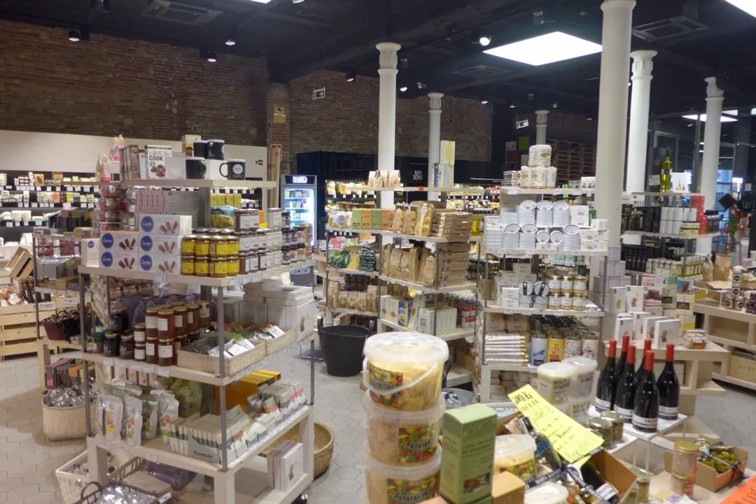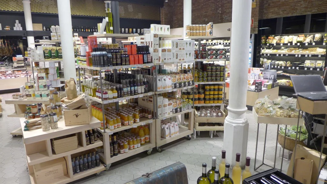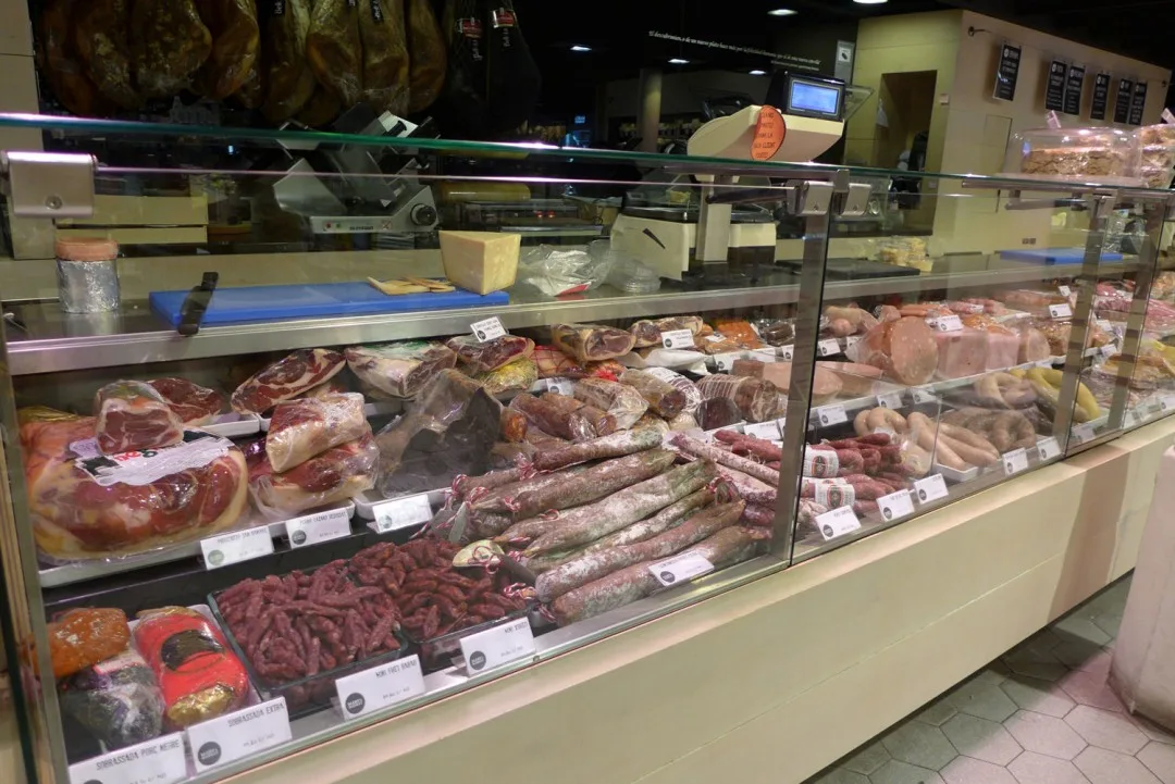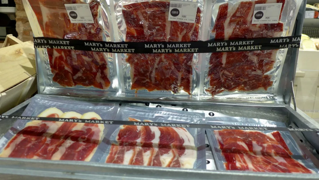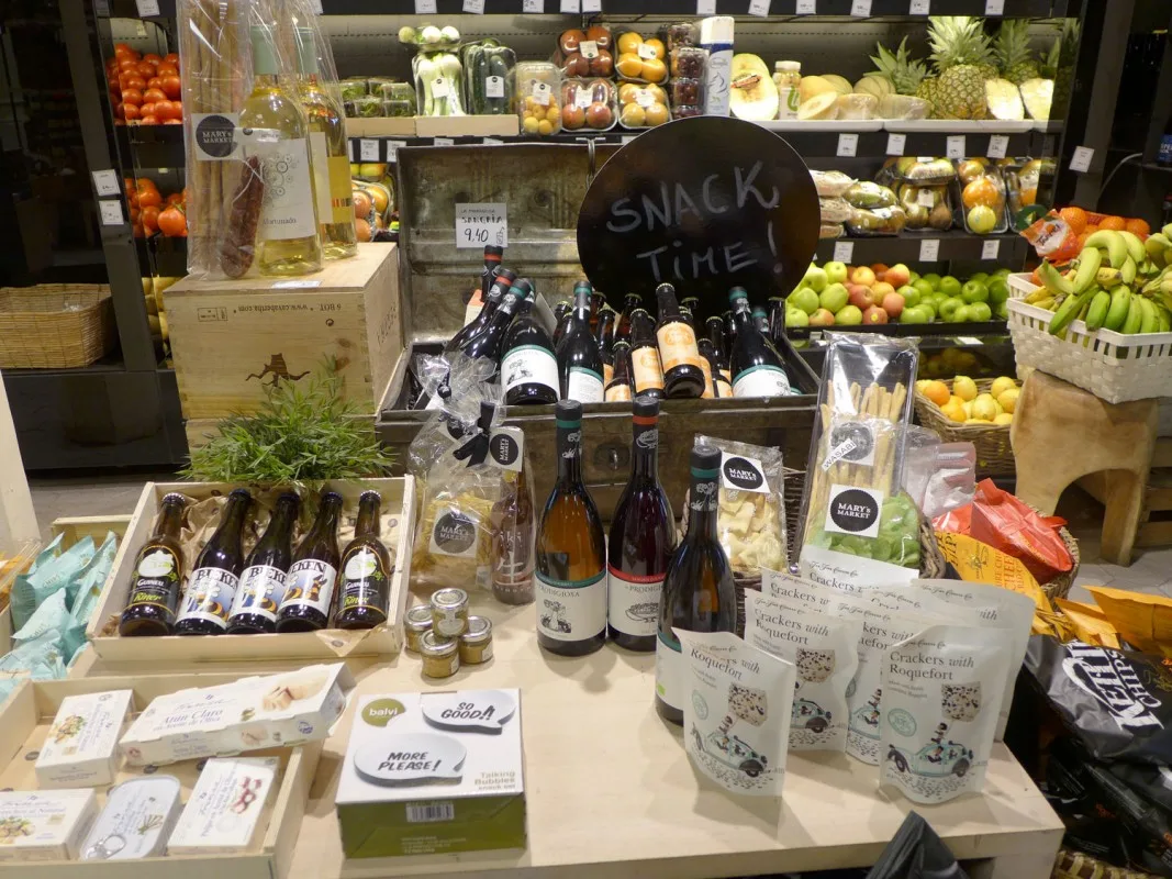 Et sted jeg vil trekke frem er Mary’s Market. Det ligger inne i et kjøpesenter langt oppe på Passeig de Gràcia. Senteret heter Bulevar Rosa og har en rar samling butikker. Noen veldig fine, andre ikke så fine. Men innerst inne i senteret ligger Mary’s Market – en fantastisk matbutikk. Her får du skinker, oster, vin, ginutstyr, salt, oljer osv. Nedenfor kan du se en bildeekstra fra butikken, og da skjønner du nok hvorfor jeg anbefaler stedet til deg.