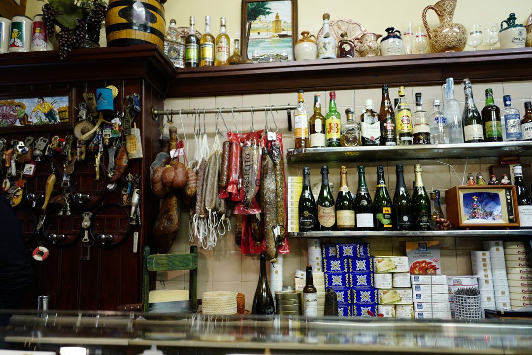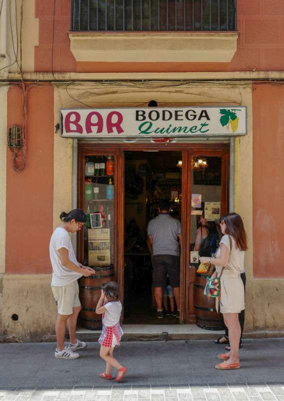 Bar Bodega Quimet er en liten tapasbar med gammel og autentisk interiør. Jeg elsker det! Får du ikke plass ved et av bordene med en gang, tar du et glass i baren eller utenfor.