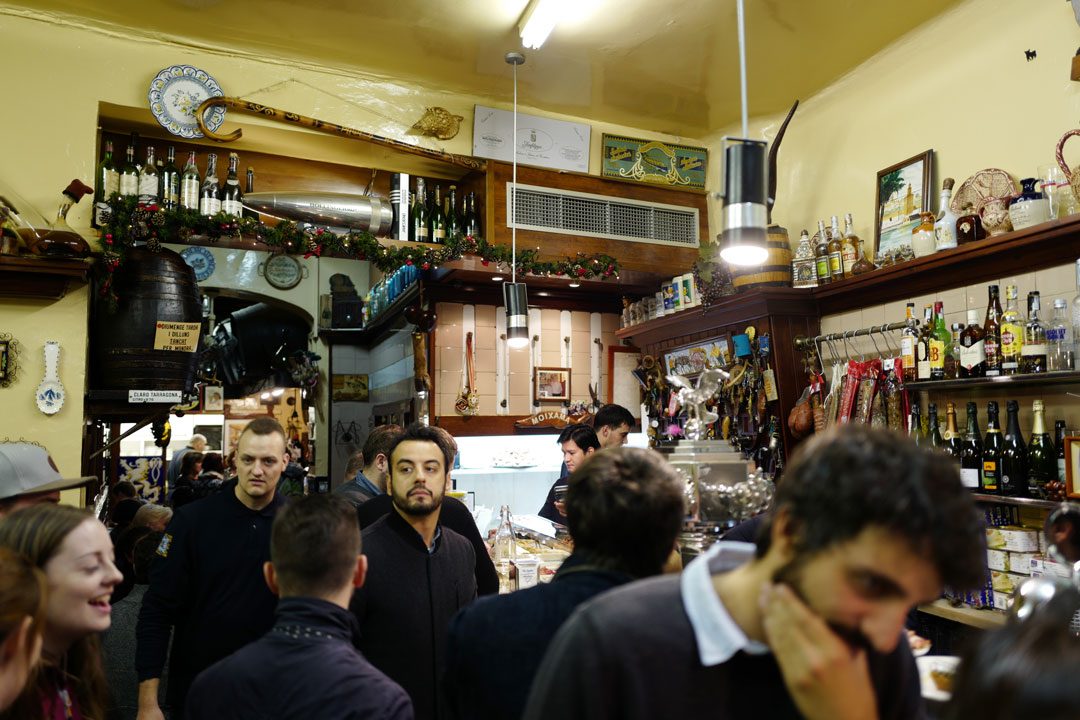Du er heldig hvis du får et av ståbordene. Ellers er det kanskje en plass ledig på hjørnet av bardisken eller langs vinhyllene. Tett og intimt i et fantastisk vakkert lokale.