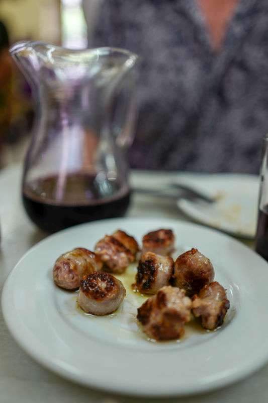 Jeg kan også anbefale chorizo-pølser og botifarra (Biter av kjøttfull pølse) som er perfekt stekt. De har også god pan con tomate her.