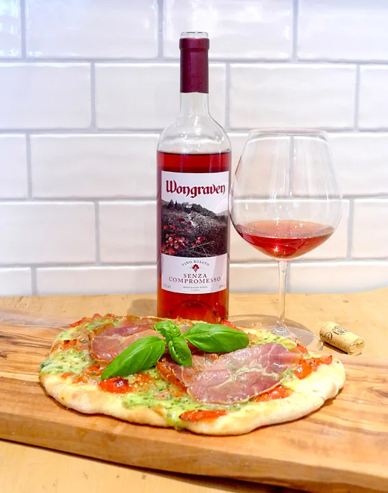 Siden dette er en vin som kan brukes der du ville valgt en lett rødvin, drister jeg meg til å lage en ganske klassisk pizza, men med ferske ingredienser. Greit å holde seg til italiensk mat når man skal drikke en italiensk vin. Sigurd Wongraven sier selv dette om vinen: «Den passer jo bra til både hvitt kjøtt, spekemat og hva det måtte være. Vi hadde den til grillede kyllingspyd med div tilbehør forleden og det var en flott match. Den er veldig lett å matche med mat».
