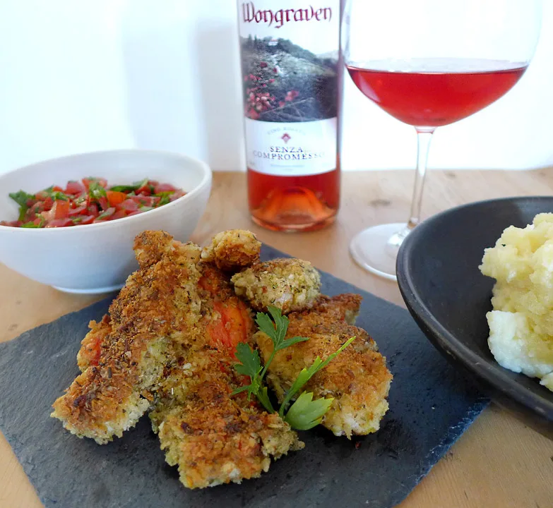 Jeg likte vinen veldig godt, og dro dagen etter på polet for å sikre meg et par flasker til. Neste rett jeg prøvde til vinen var kongekrabbe laget på samme måte som jeg lager italiensk, panert kylling med en siciliansk hjemmelaget krydderblanding. Til disse kongekrabbe-nuggetsene serverte jeg kremete potetmos og tomatsalat med bladpersille. Vinen sto som en påle til dette måltidet også. Kjøp rå kongekrabbe hvis du skal lage denne retten, for de ferdigkokte er ofte for salte og har da en litt emmen, metallisk smak, som ikke vil fungere til vinen.