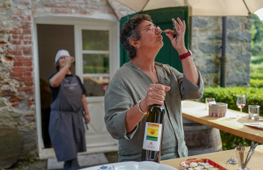 Castello di Montecavallo (100% nebbiolo). Chiara Redda jobber sammen med vinmaker Andrea. Jeg fikk æren av å spise lunsj på slottet sammen med Chiara der hun fortalte om vingården sin. Det har blitt laget vin her for over 1000 år siden. Før hadde familien hennes ca 8 hektar vinmarker. Hun tok over driften i 2000. Hun har nå ca 3 hektar. Familien har gitt bort den beste vingården til munker som bor på området. De produserer vinen sin i det gamle vineriet. Chiaras viner lagres i det nye vineriet som hun har fått bygget i den gamle stallen.