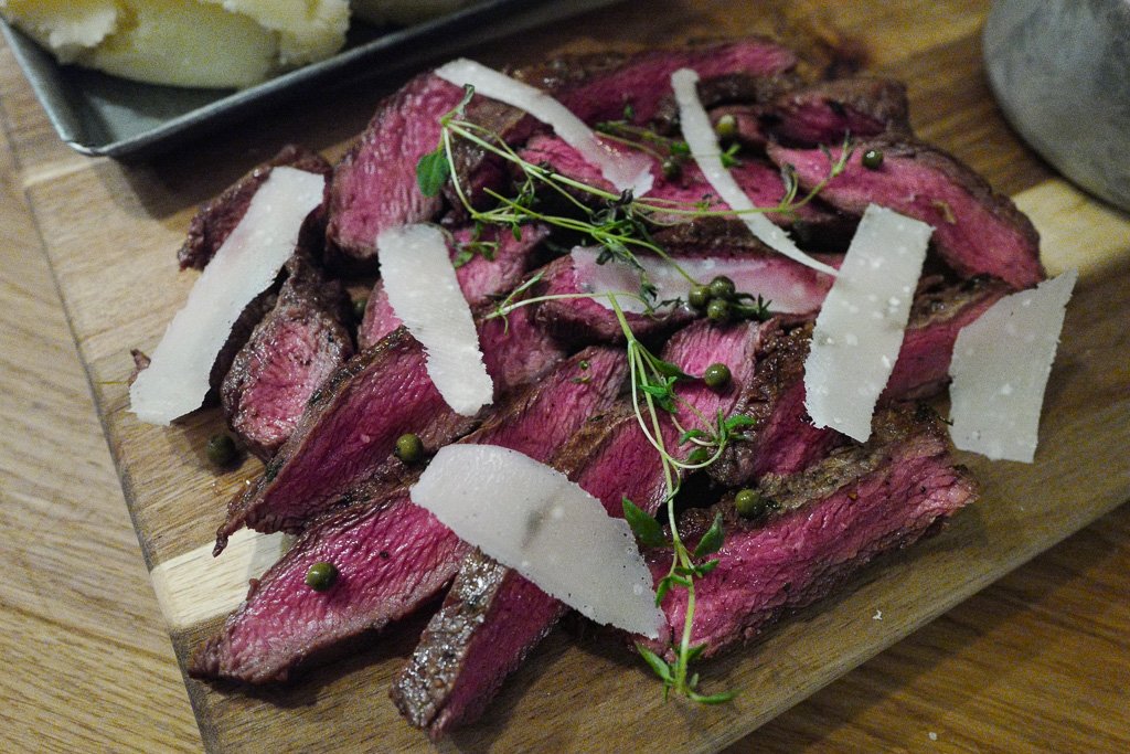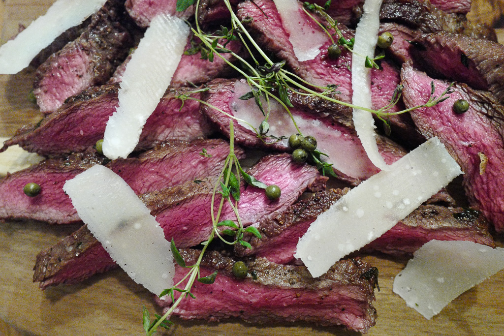 Kjøttet: Stek kjøttet i god olivenolje, en klatt smør, et par kvister timian og hvitløksfedd. Dette gir god smak. Nyretapp-fileten er tyn, så den trenger ikke mange minutter i pannen. La kjøttet hvile før du skjærer det i skiver. Legg det på en fjør og høvle Parmareggio over med en potetskreller. Du kan også pynte med noen grønne pepperkorn og litt timian. Dryss litt flaksalt over.