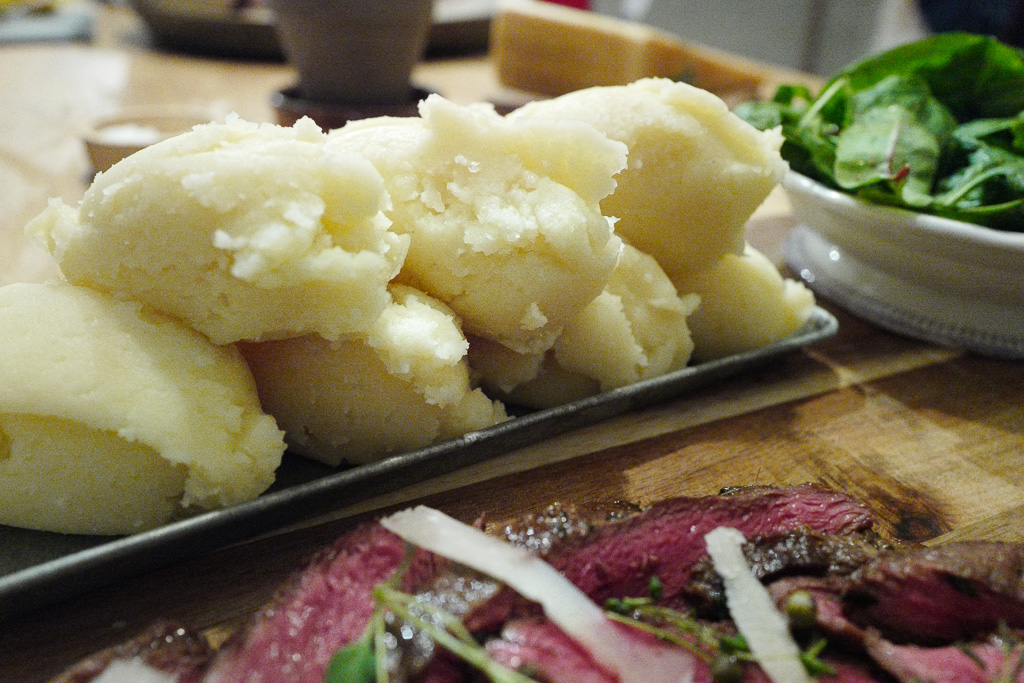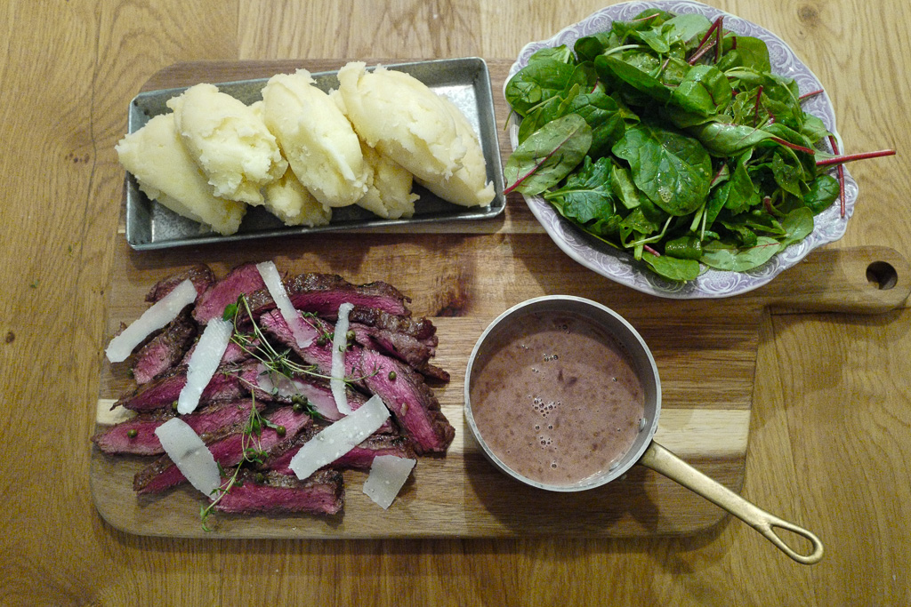 Potetpuréen er egentlig en luftig mos. Jeg lager den på vanlig måte, men helt til slutt pisker jeg inn masse finrevet Parmareggio – parmesanost. Det gir en helt spesiell smak som kler kjøttet, peppersausen og salaten.