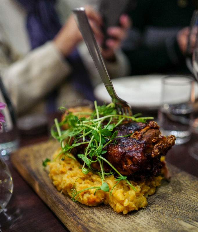 Neste rett er også en lokal spesialitet: Langtidsstekt svineknoke med sennep og krydret, grov rotfruktmos. Denne serveres Sharing Style – som er en måte jeg elsker å spise på.