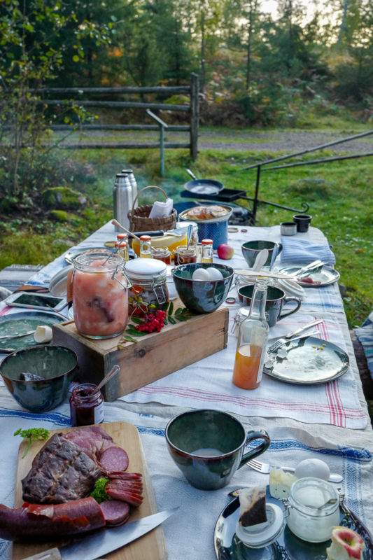 Vi nyter en fabelaktig frokost i det fri med egg fra gårdens høner, hjemmebakte polarbrød, oster og skinker fra nærmiljøet og syltetøy, kompotter og yoghurt fra gården. Blir du ikke sentimental av å oppleve dette, må du rett og slett oppsøke hjelp. Det er en så vakker og spesiell opplevelse som rett og slett tar pusten fra deg. Mat utendørs og kaffe har sjelden smakt bedre.
