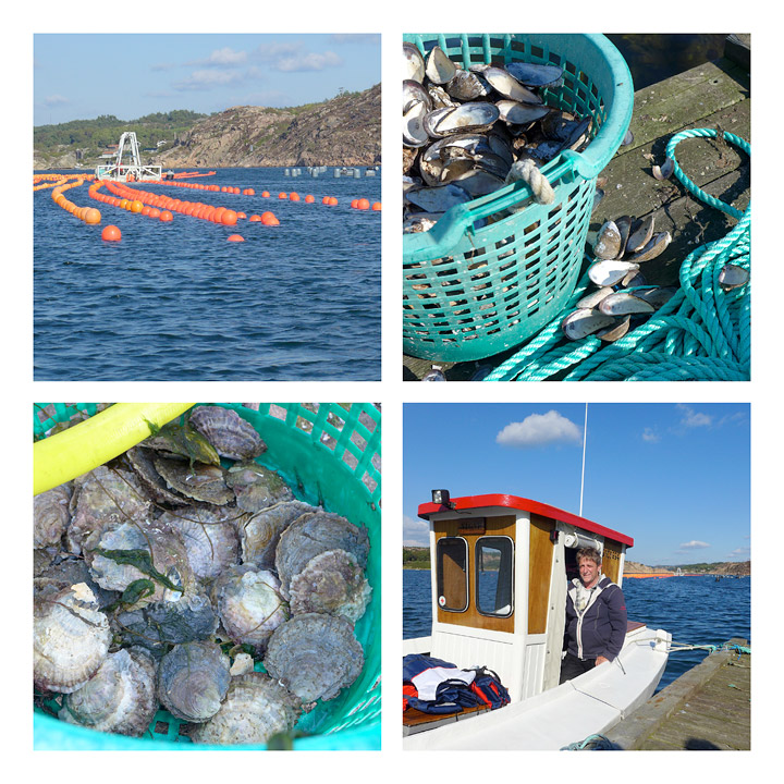 Jeg var med skipper Lars ut i båten hans «Signe» (oppkalt etter hans bestemor). Lars arrangerer øster- og blåskjellturer i skjærgården utenfor Lysekil i området Bohuslän (220 km fra Oslo). Solen skinte og vannet var blikkstille da vi ankom en liten øy der Lars har sine 20 sauer og en liten hytte. Herfra kan man se utover vannet der blåskjellene dyrkes på tau og hvor østersene vokser. I juli er det parringstid for østersen. Små larver (ja for det er det både blåskjell og østers er når de blir født) sprutes ut i havet og de må selv finne et sted å feste seg. Derfra vokser de seg store til skjellene vi kjenner.