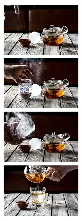 Fyll et røreglass med is og stikk oppi en teklype med kamomillete.