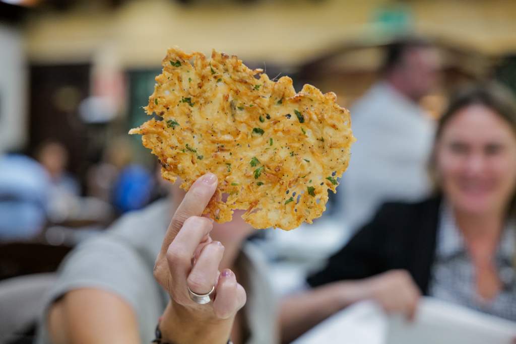 Vi smaker en av de mest kjente rettene fra Cadiz, Tortillitas de Camarones. Dette er tynne kjeks laget av kikertmel, løk og små reker. De frityrstekes til de er sprø. Jeg må innrømme at dette ikke var den beste varianten av retten, så jeg har et bedre tips til deg når du leser lengre ned i saken.