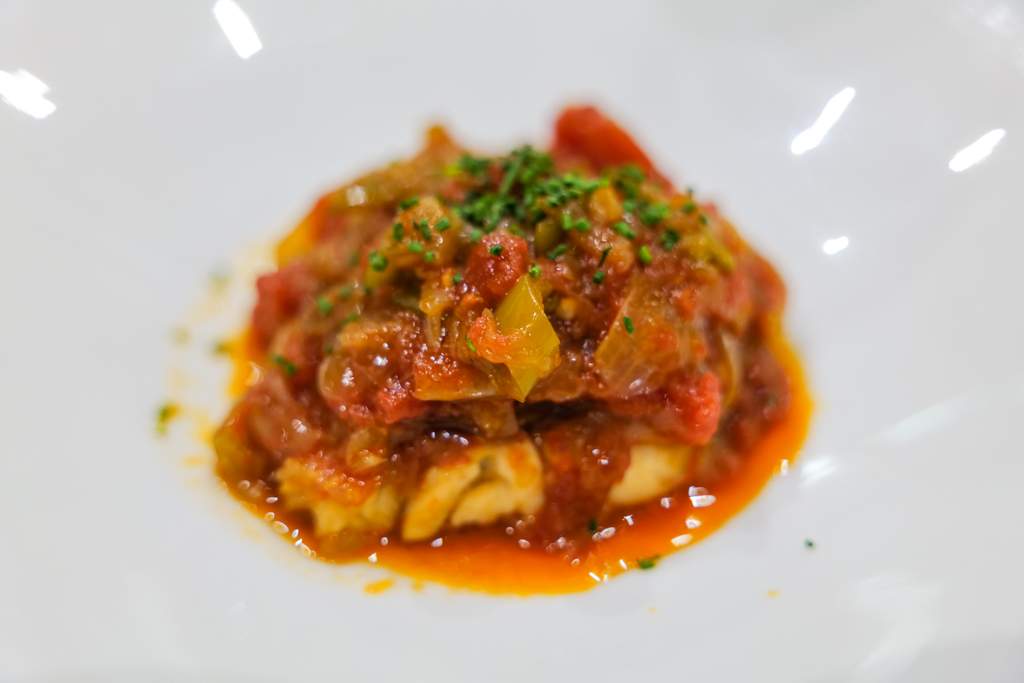 Så spiser vi hovedrett og min Guiso de Pescado de Roca a la Roteña er en deilig rett med tomat, løk, paprika, potet, sherry og selvsagt et deilig stykke fisk som i dette tilfellet er abbor.