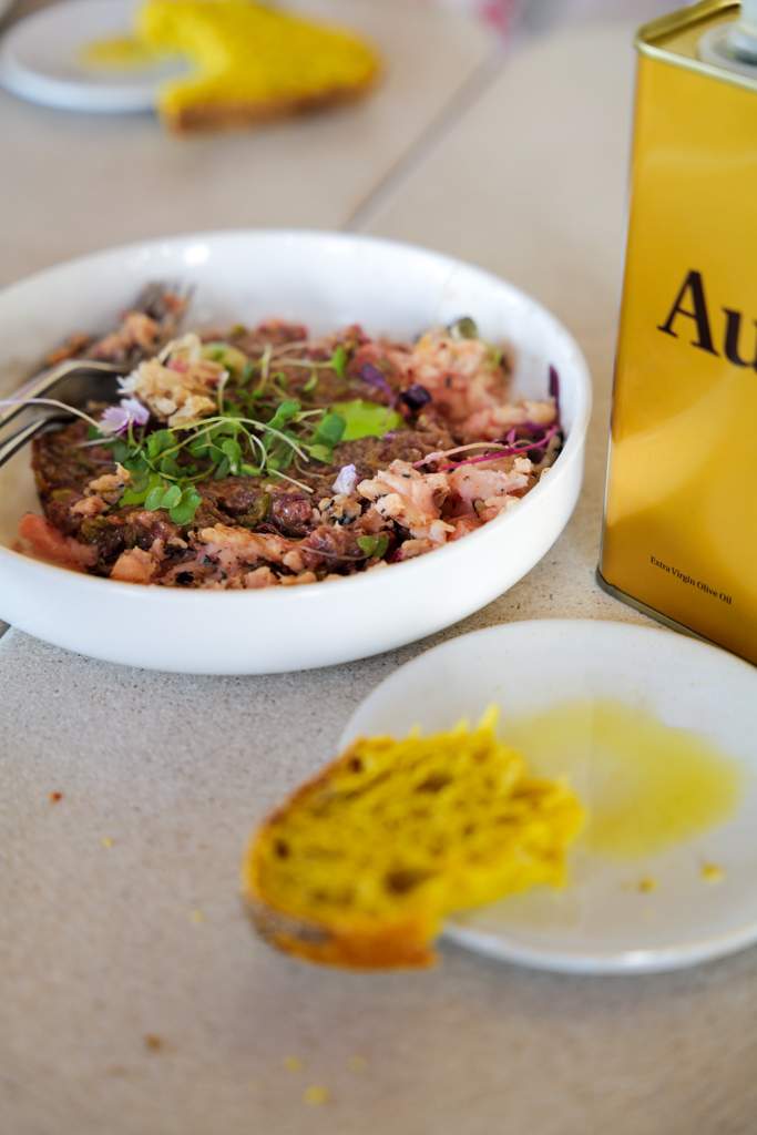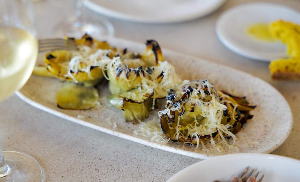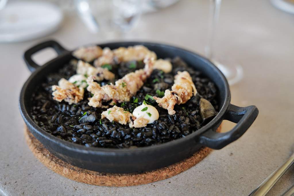 Vi spiser artisjokk med payoyo-ost, tartar med beinmarg og grønnsaker, små, grillede akkar, reker i olje og hvitløk og en stor panne sort ris.