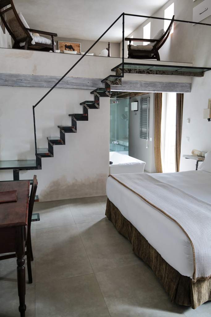 Vi bor på boutiquehotellet Hotel V. Det er helt spektakulært. Fra takterrassen kan du se utover hele den hvite byen mens du ligger å sløver på en solseng med en cocktail i hånden. Hotellet har få rom, men alle er innredet forskjellig med antikke møbler i utsøkt stil. Jeg er personlig ikke stor fan av åpne baderomsløsninger, men ikke alle rom har det, så er du like sjenert som meg ville jeg ha sjekket om dette før man bestiller rom slik at man får et med lukket bad.