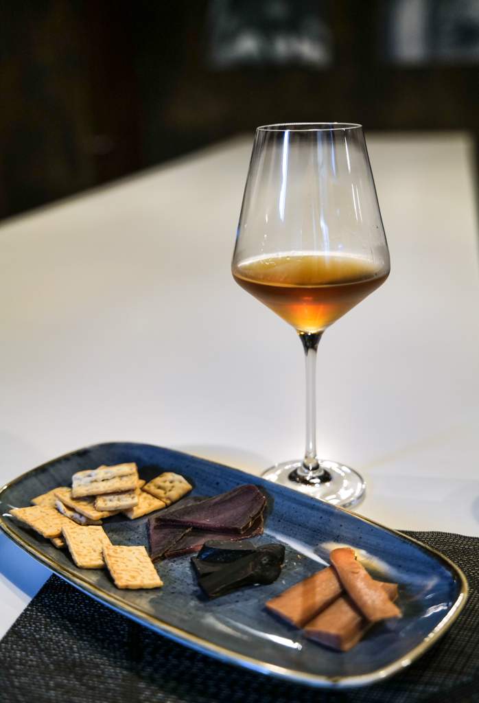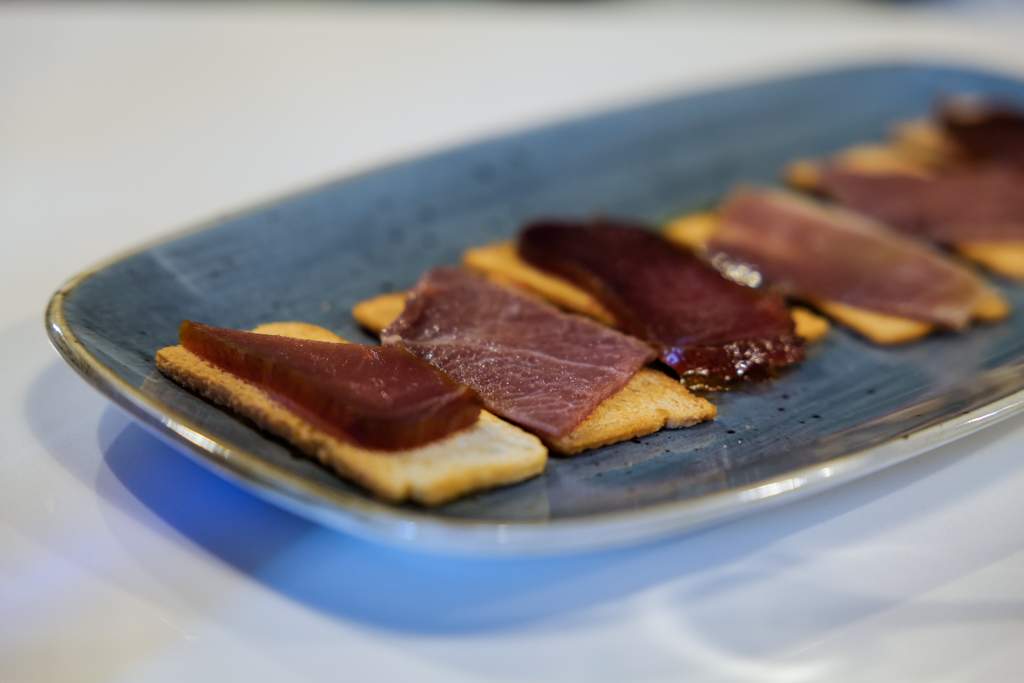 Vi smaker oss igjennom forskjellige saltede tunfisk-varianter som omtales som “Jamon of the Sea”, altså havets spekeskinke. Mojama er navnet på speket tunfisk. Jo lengre speketid jo kraftigere smak. Det er interessant å smake mild speking oppimot fisk med lang speking. Smaken forandrer seg så mye. Sørg også for å smake speket rogn. Kraftig og litt oksidert i smaken. Kan anbefales med et glass Palo Cortado til.