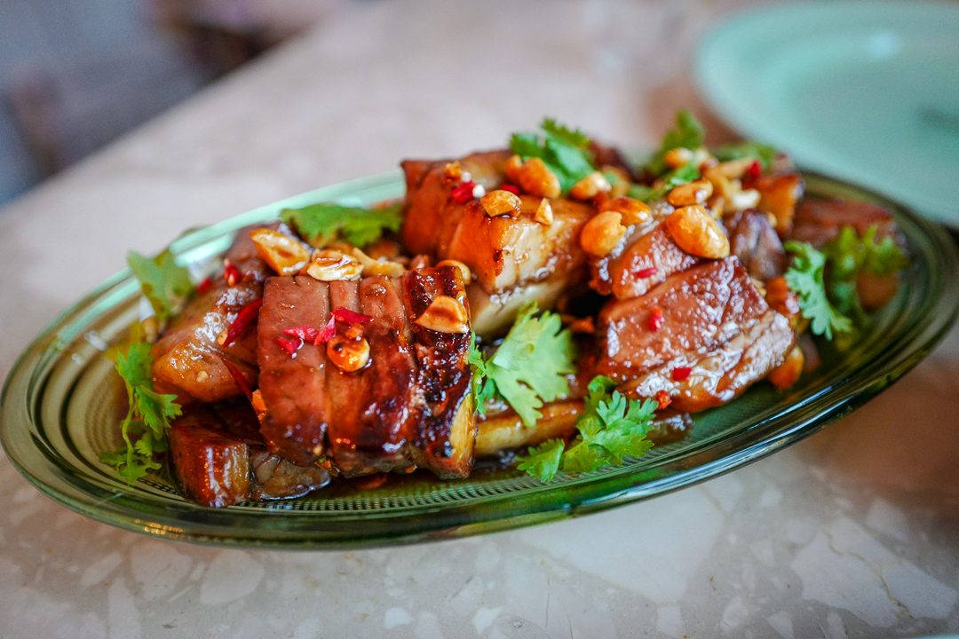 Skjær ribben i stykker. Ha noen sauseskjeer med saus i pannen. Kok opp og legg ribbestykkene i pannen. Nå skal sausene karamelliserer seg rundt ribbestykkene slik at du får deilig stekeskorpe på ribben. Når du ser at sausen begynner å bli mørkere slår du av platen tvert og trekker pannen av platen. Strø grovhakkede peanøtter over samt et generøst dryss med korianderblader og kanskje litt mer limesaft og hakket chili?
