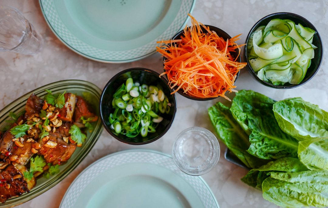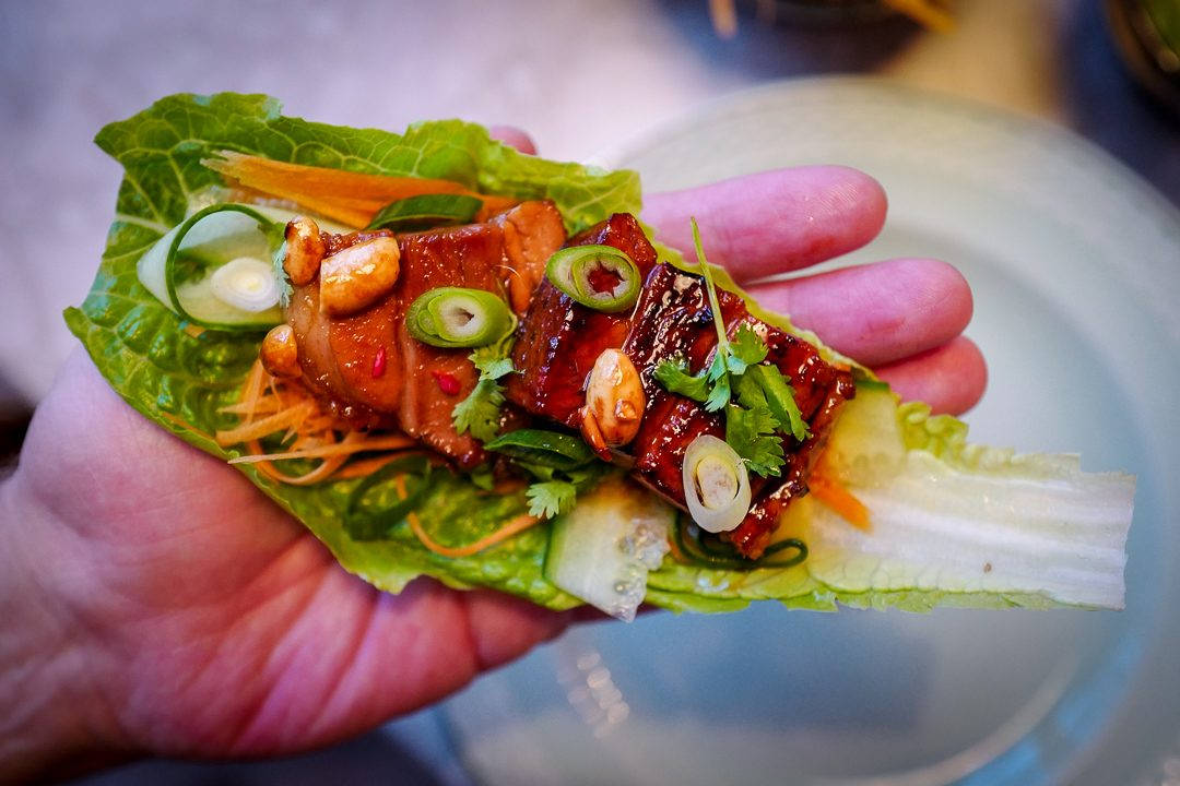 Legg litt av alt på salatbladene med revet gulrot og syltet agurk. Få med sausen fra ribben og litt frisk koriander og vårløk på toppen. Lykke!