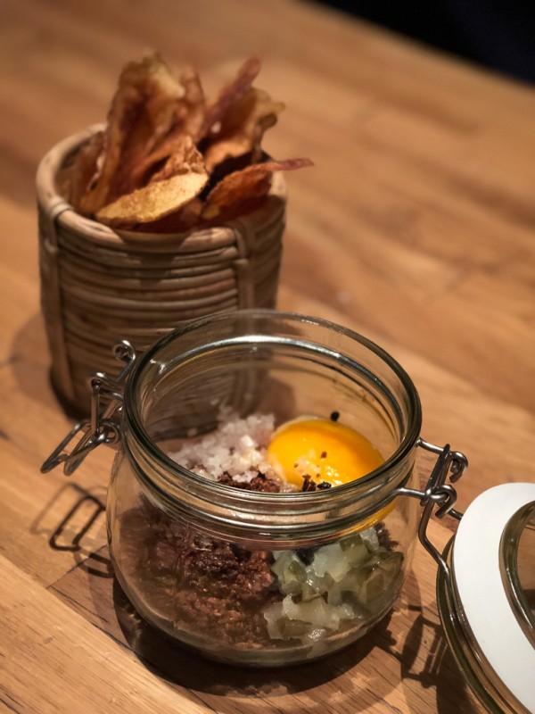 Min favoritt denne kvelden er en røkt tartar servert med hjemmelagde potetchips. Tartaren røykes to ganger med epletre: Først på kjøkkenet før tartaren hakkes manuelt, og så ved servering. Tartaren kommer nemlig inn i krukke med lokk. Når man løfter av lokket strømmer den deilige og milde røyken ut i rommet. Tartarkjøttet ligger i krukken sammen med hakket cornichons, løk, Avruga-kaviar og eggeplomme konfitert i brunet smør. Oh man, de dreper meg av glede med all dette brunede smøret!