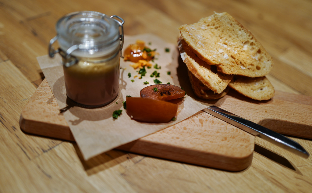 Så kommer det inn en liten fjøl med et glass med kyllinglevermousse og trøffel, brunsmørtoast og syltede plommer. Når man åpner lokket på glasset velter det ut en herlig og intens duft av trøffel. Det er aldri feil, for å si det slik.