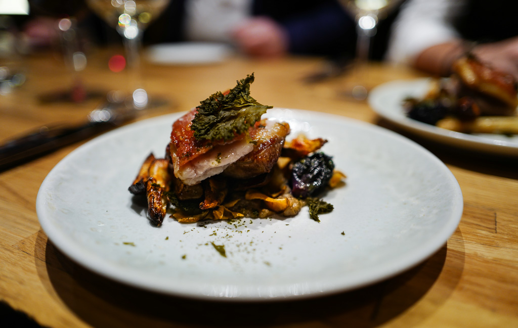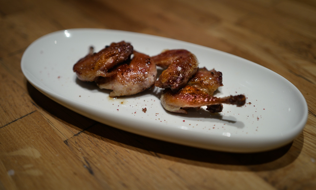 Konfiterte vaktelvinger med honning- og pepperglaze er et nytt høydepunkt. Den perfekte munnfull som gir deg lyst til å bestille en ny porsjon. Kjøttet faller fra beina og smaken er så delikat som du får det. Perfekt champagnemat.