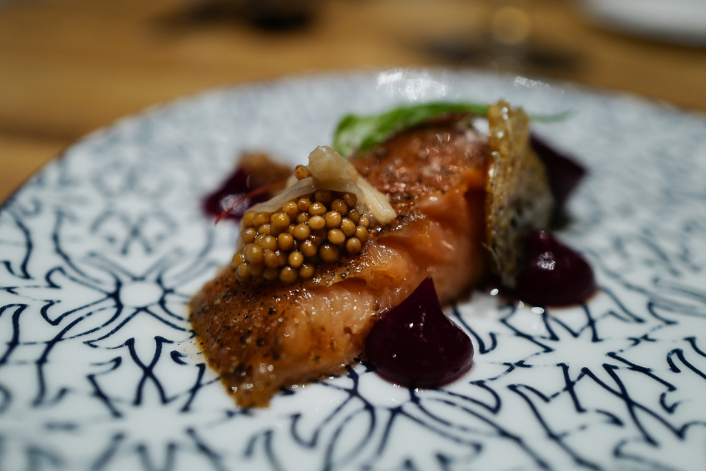 Den norske laksen behandles på samme måte som klassisk pastrami, som vi kjenner fra Midtøsten og New York. Pastrami lages vanligvis av oksebryst som legges i lake, krydres og kaldrøkes flere ganger før det så dampes. Laksen smelter simpelthen på tungen. Laksen serveres med sprøtt lakseskinn, rødbeter, rødbetegelé, syltede sennepsfrø og enokisopp.