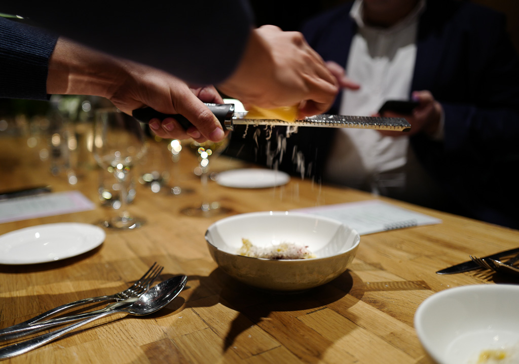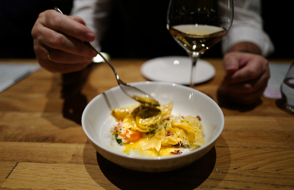 Neste deleforrett er en porsjon ravioli a la carbonara fylt med kantarell og ricotta. Sprøstekt og røkt panchetta er strødd over retten. Parmesan rives over pastaen og et par drag med pepperkverna gir den nødvendige heten retten trenger.