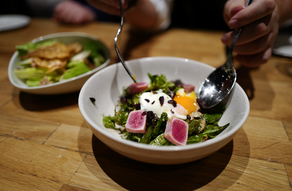 Salad Niçoise gourmand serveres med sukkererter og fersk tunfisk stekt på taktaki-vis. Den kommer med potetskiver, ferske oliven, men også tørkede oliven, som gir en helt annen smak og følelse i munnen. Retten serveres med et perfekt posjert egg tilberedt ved 62 grader. En slik temperatur gir fast eggehvite og flytende plomme. Dette er en spennende nytenkning av en gammel klassiker.