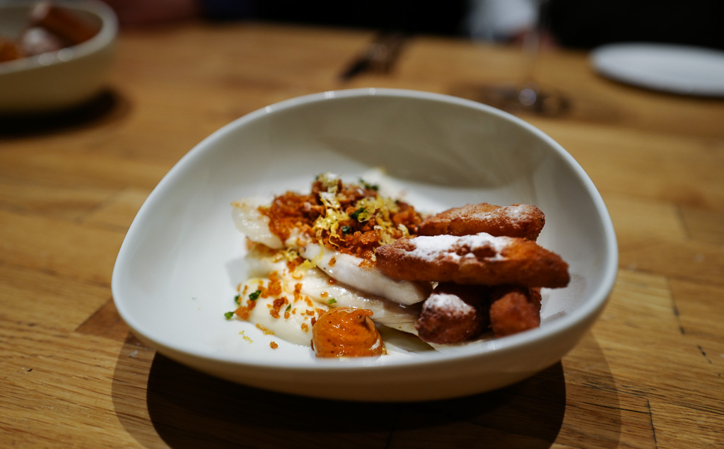 Dette er altså en rett med piggvar som er perfekt tilberedt. På toppen ligger brødkrummer. Chipsene er laget av sellerirot og rullet i panko. De er så sprøstekt. På toppen har de drysset eddik- og sitronpulver for å få den autentiske smaken av Fish and Chips. I stedet for remulade har de laget en salmorejo. Dette er egentlig en suppe laget av tomat, brød og olje. Denne salsaen minner mer om en romanesco-salsa lager på paprika og nøtter. God er den, dog litt fremmed i settingen. En hjemmelaget remulade ville kanskje vært bedre.