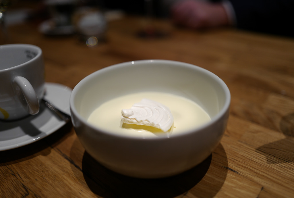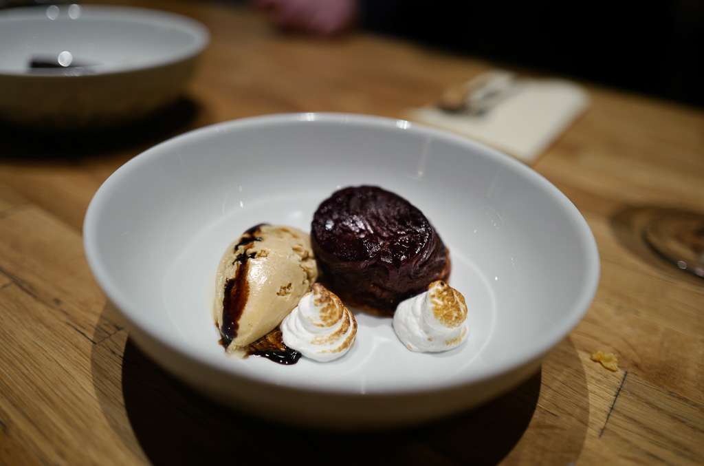 Siste dessert er Madus tolkning av Tart Tatin med en eple- og balsamikoreduksjon, iskrem laget på muscovado-sukker og sveitsisk marengs. Også denne er en utsøkt dessert som er vakkert presentert. Tatin’n er perfekt bitter og iskremen er ikke alt for søt. Smart bruk av muscovado. Nydelig balansert.
