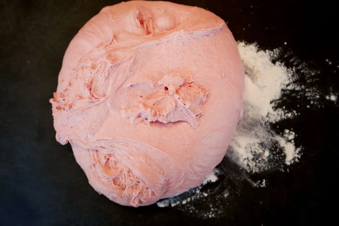 Sett igang kjøkkenmaskinen og elt dette sammen med gjærvannet og rød farge. Elt i 10 minutter til konsistensen er glatt. Sett til heving i 1 time på et lunt sted med plast over.