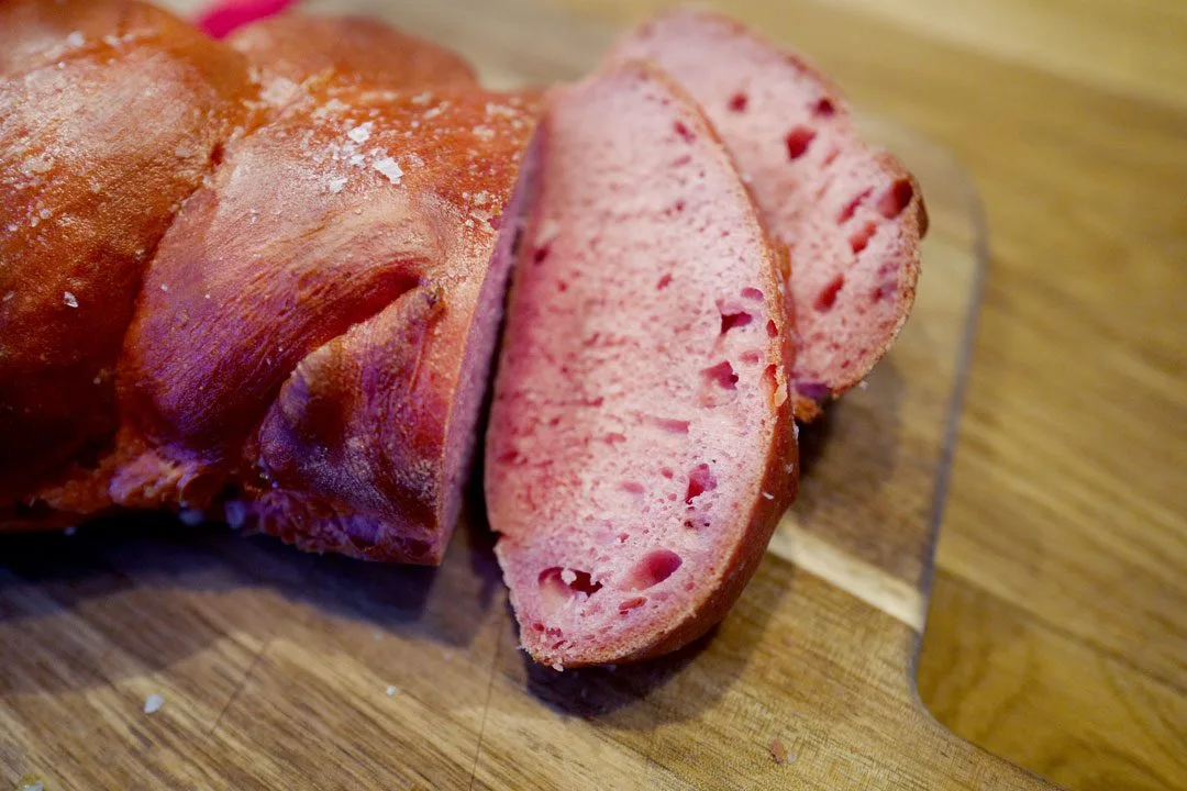 Du kan farge brøddeigen din med rødbetejuice eller konditorfarge. Du kan faktisk bake med rødbeterestene etter juicepressing også. Her har jeg en oppskrift på det.
