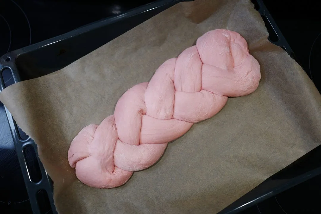 Trill ut tre like store pølser. Flett deigen og legg fletten på en stekeplate med bakepapir på. La fletten heve i 30 minutter under plast. Pensle med vann og sett midt i ovnen på 200 grader i ca 15-17 minutter. Ta ut og sett på rist.